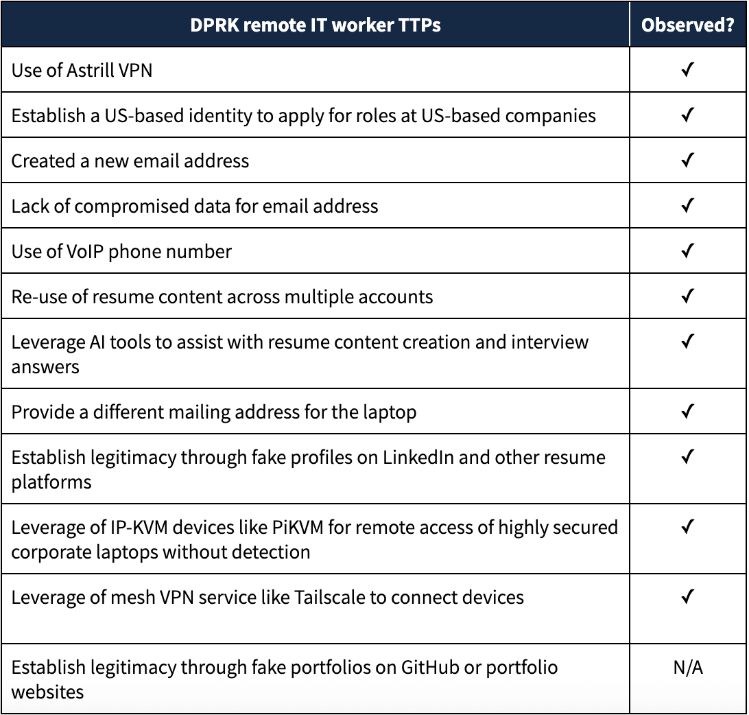 Since early 2023, Nisos has provided our clients with critical insights and conducted OSINT (Open-Source Intelligence) pre-employment and insider risk investigations to mitigate the threat of North Korean (DPRK) IT worker employment schemes. In June 2025, we used a combination of pre-employment OSINT due diligence and targeted interview questions to expose a suspected DPRK operative, who applied for a remote Artificial Intelligence (AI) architect role at Nisos. The operative unsuccessfully used stolen personally identifiable information (PII), a newly created email, and an AI-created resume to pose as a Florida-based lead AI architect and senior full stack developer. Nisos subsequently identified an employment fraud network involving the IT worker, which included a laptop farm located in Florida. Our investigation of the laptop farm identified that DPRK IT workers leverage Raspberry Pi-based KVM (Keyboard-Video-Mouse) devices to remotely access desktops and mesh VPN services like Tailscale to connect multiple devices to a network they control despite being located across US residences. Nisos also identified the following well-known suspected operative tactics, techniques, and procedures (TTPs) during the investigation and interview, which are linked to DPRK IT workers: